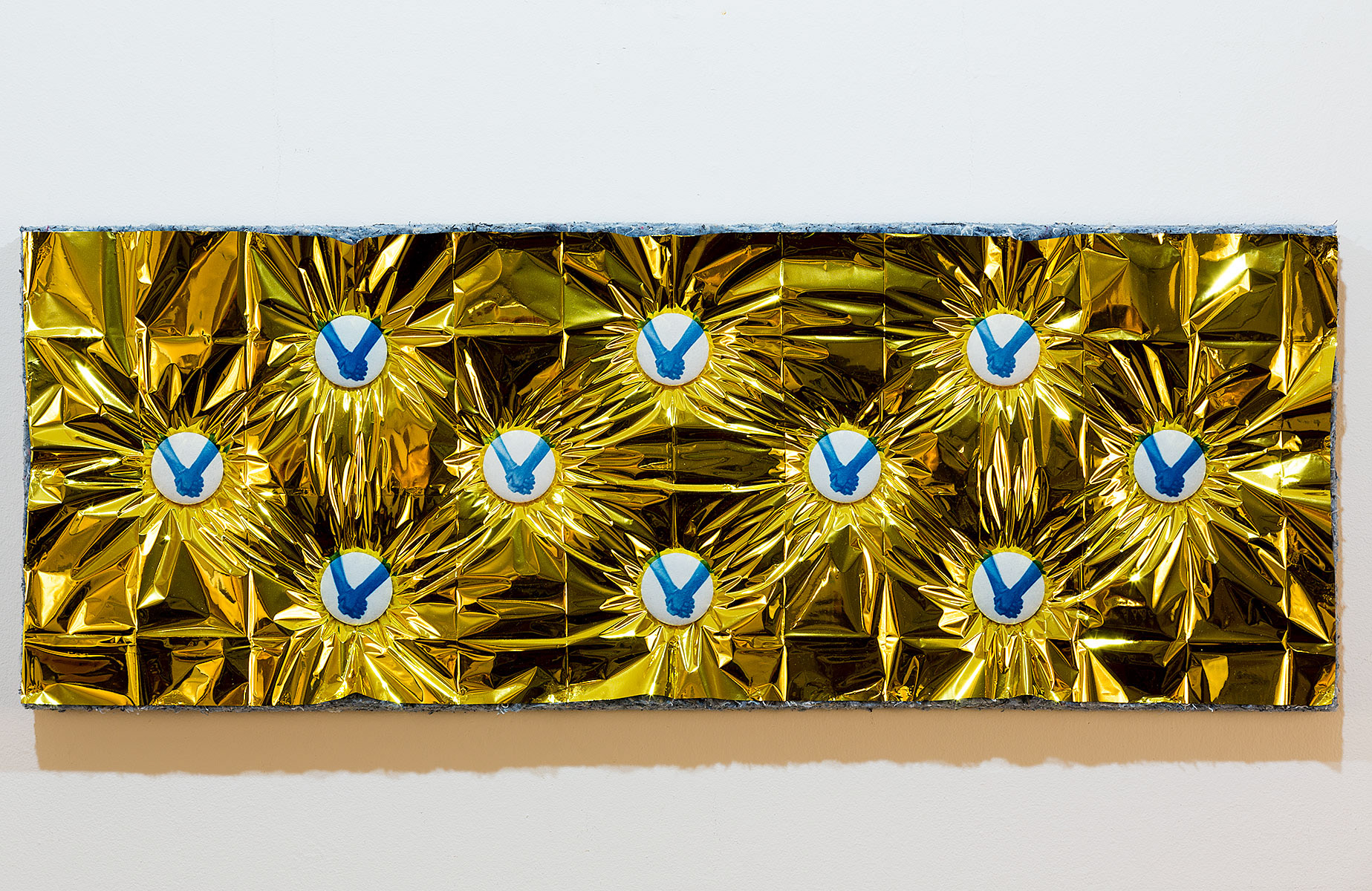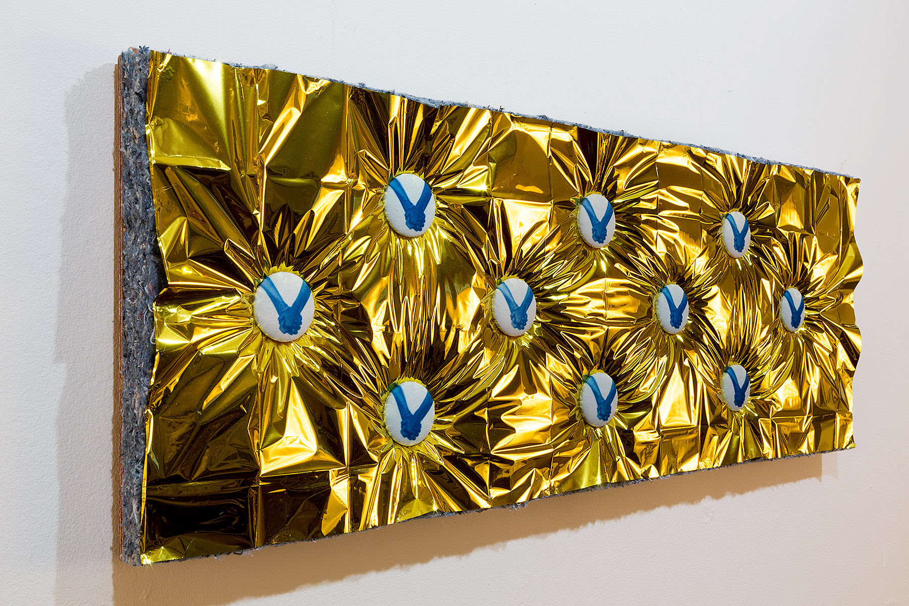 cyanotype on cotton, upholstery buttons, emergency blanket, recycled jeans, plywood and thread